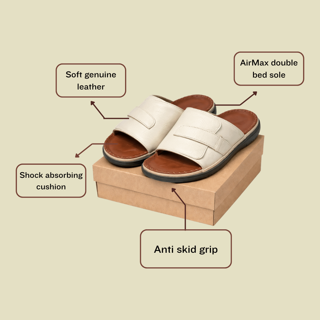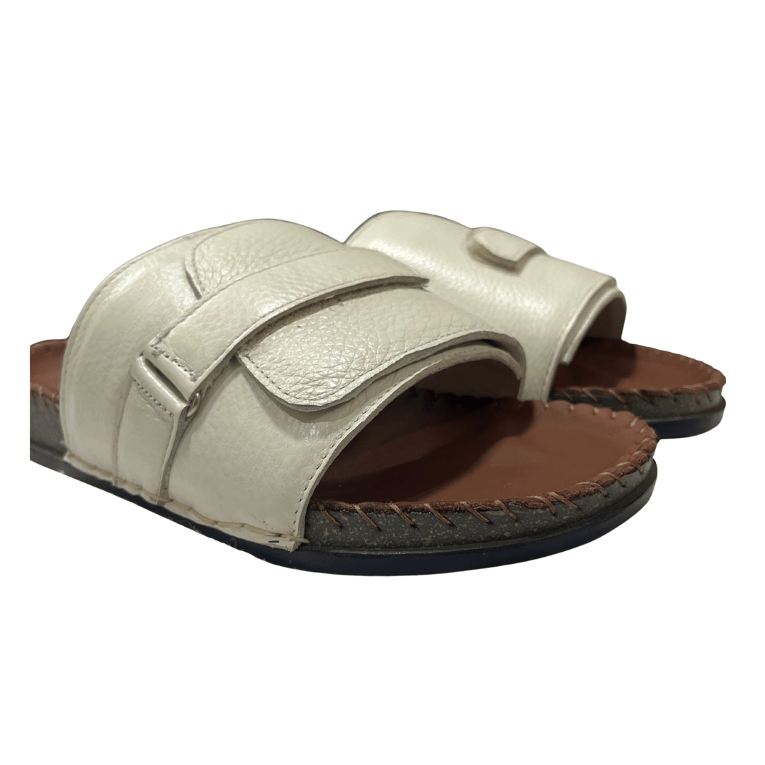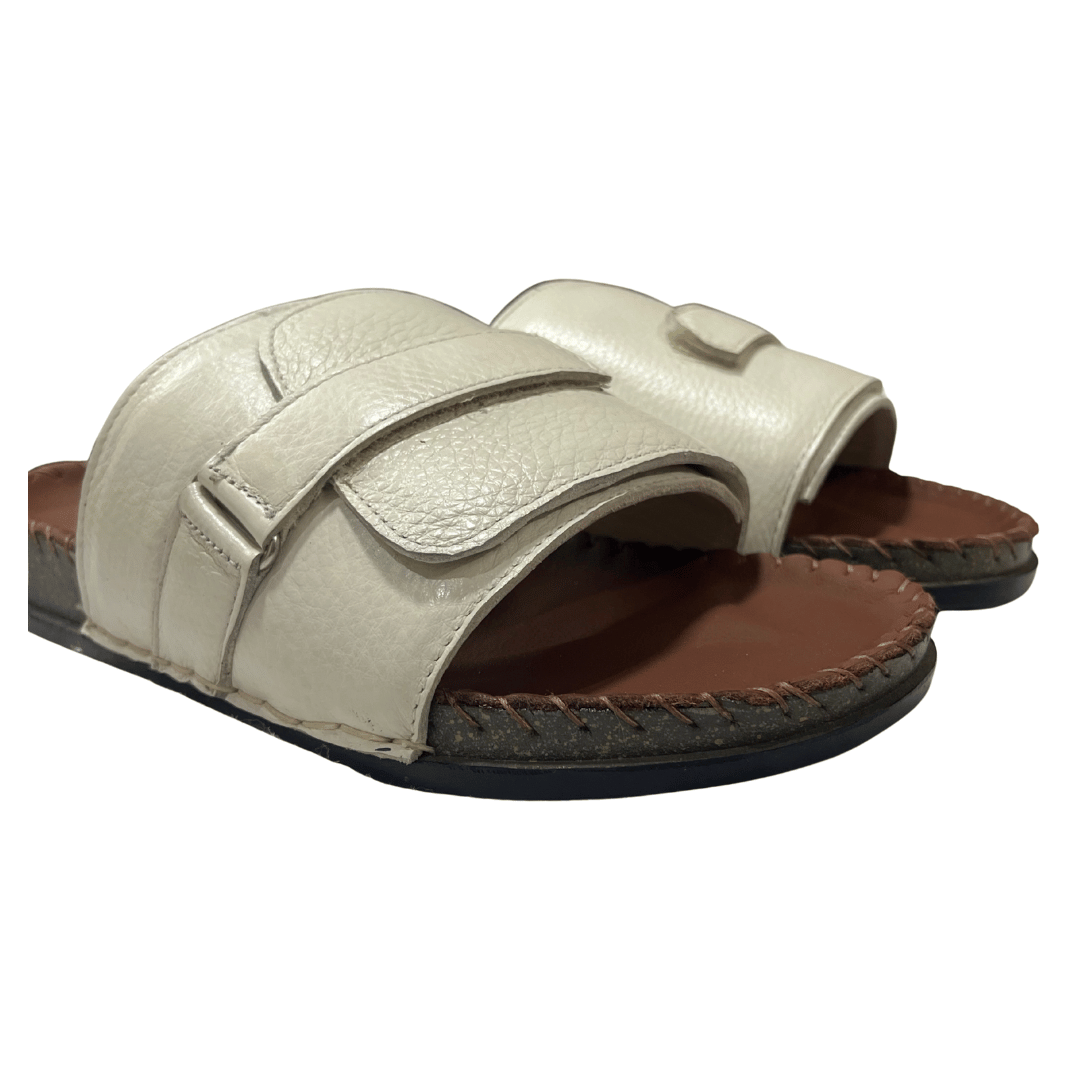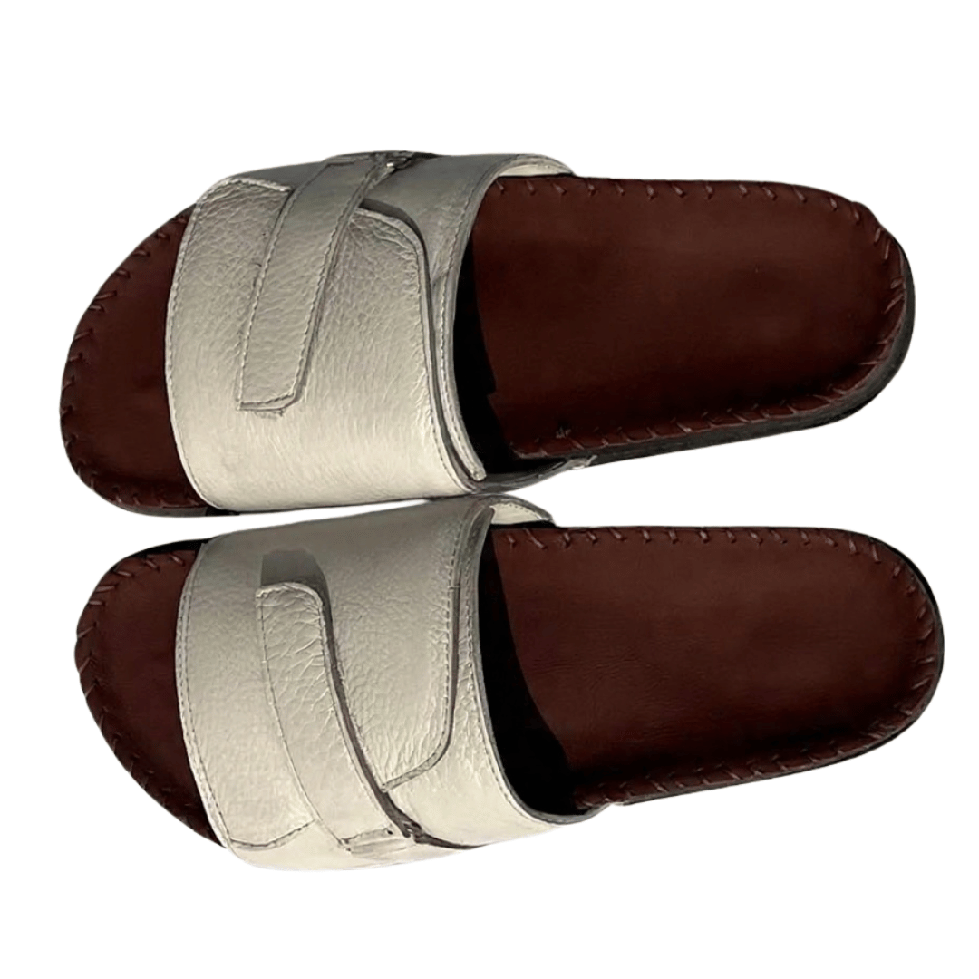 • Handcrafted luxury leather sandals featuring a soft white texture upper strap paired with a brown leather footbed and premium double bed sole.